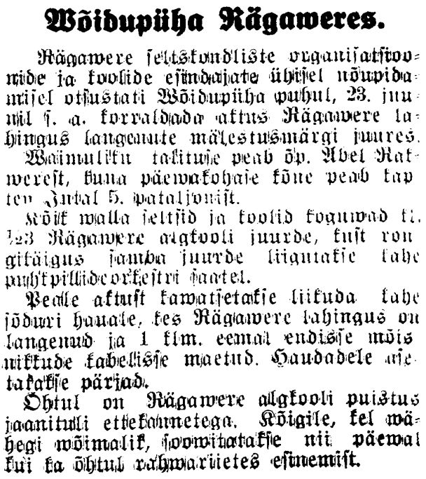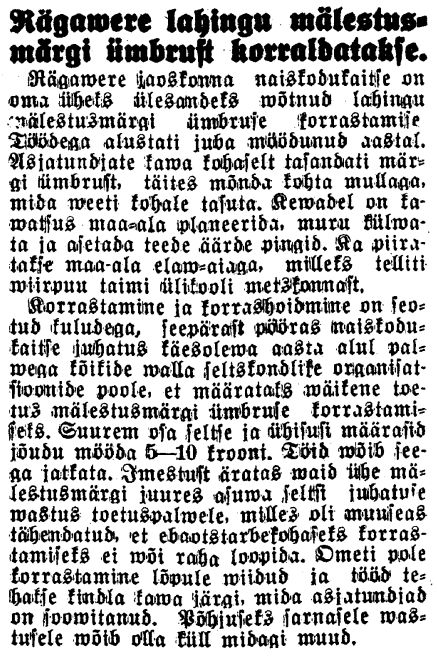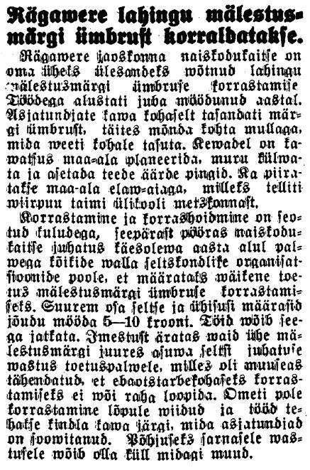 "Virumaa Teataja" 26.07.1930: vald annab 30 krooni. Tulekul on Rägavere naiskodukaitse korraldatav pidu, mille kasum läheb monumendi püstitamiseks.