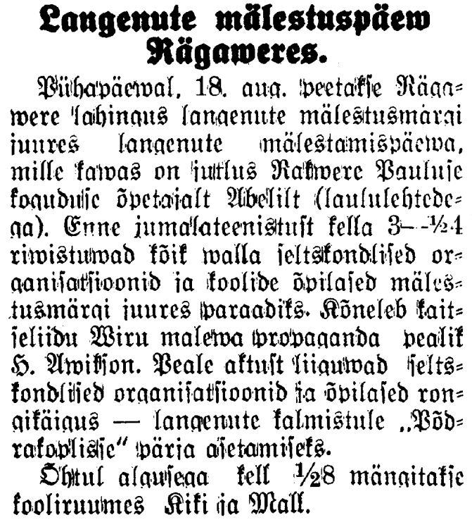 - Avakõne pidas mälestusmärgi püstitava komitee nimel Rägavere algkooli juhataja A. Mikael