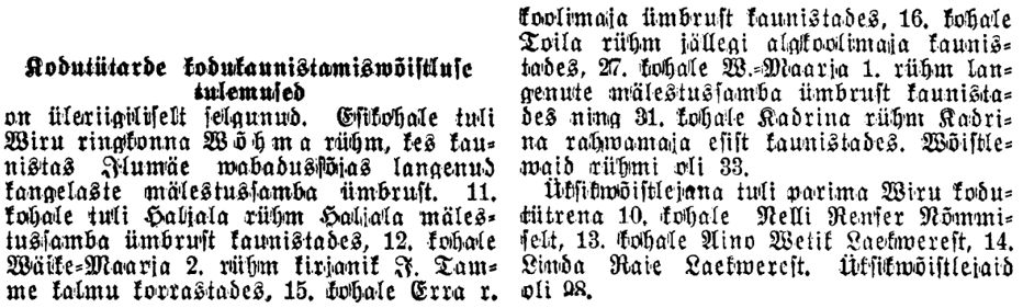 "Virumaa Teataja" 10.12.1937. Üleriigilisel kodutütarde kodukaunistamise võistlusel sai esikoha Viru ringkonna Võhma rühmale, kes kaunistas Ilumäe Vabadussõja monumendi ümbrust.