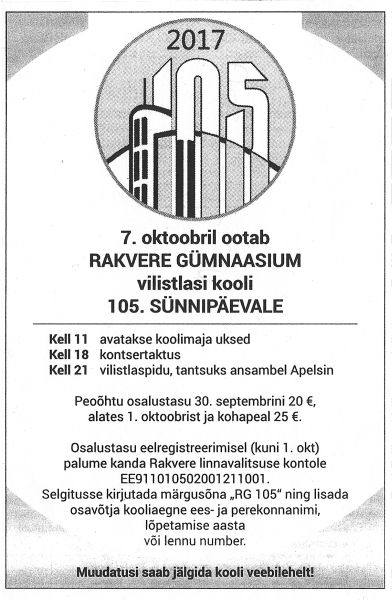 - 31.08.2017 - tulekul on kooli 105. sünnipäev.