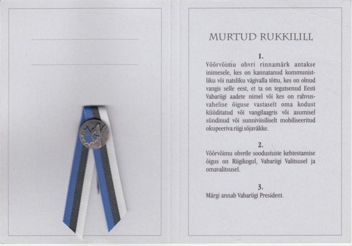 Trükis koos rinnamärgiga "Murtud Rukkilill", HKM _ 4961:1 A 2219, Hiiumaa Muuseumid SA, http://www.muis.ee/museaalview/2012385.