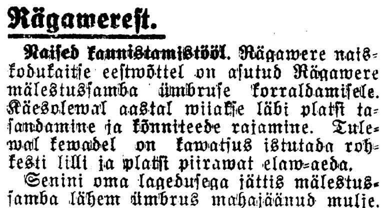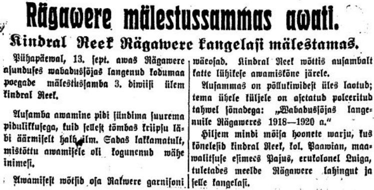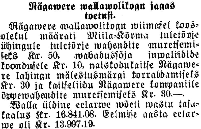 "Virumaa Teataja" 26.07.1930: vald annab 30 krooni. Tulekul on Rägavere naiskodukaitse korraldatav pidu, mille kasum läheb monumendi püstitamiseks.