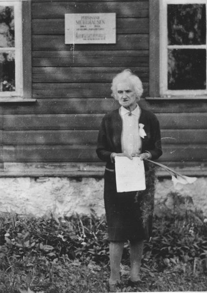 Ferdinand Mühlhauseni tütar Gerda Feldt esinemas mälestuskivi avamisel. Rakke muuseum.