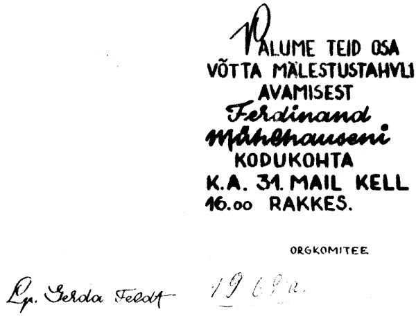 - Mühlhauseni populaarseima laulu "Armas isamajakene" saamislugu mäletab Oskar Krusberg Rakkest (tema oli Ferdinandi loodud viiside üleskirjutaja):