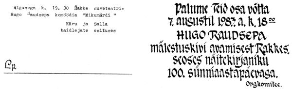 - Õhtul esitasid Käru ja Salla näitemängijad Rakke suveteatreis H. Raudsepa komöödia "Mikumärdi".