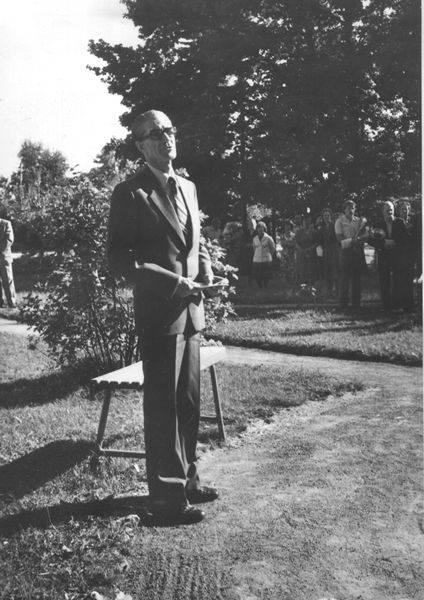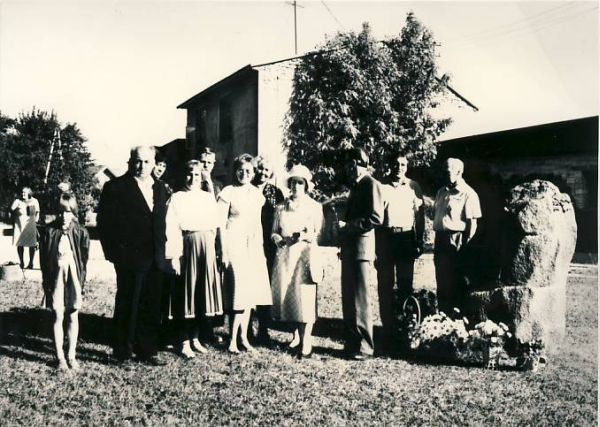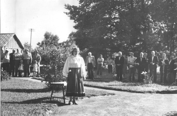 Lapsed Pille Muru ja Eigo Kinnep asetasid lillekorvi, katte eemaldasid külanõukogu esinaine Maire Annast, V.Lehtla, B. Lehtla. Eesti Kirjandusmuuseum.