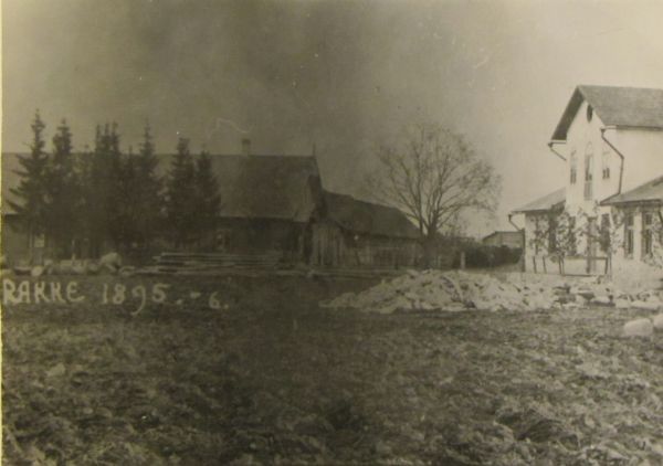 Rakke Kalmu pood 1895 (paremal pood, vasakul taluhooned) Raudsepp töötas siin 1901-1906. Eesti Kirjandusmuuseum.