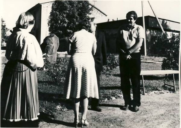 Aime Kinnep ja Reet Tomband tänavad Valter Lehtlat (varjus) ja Rakke Lubjatehase direktorit Borja Lehtlat kivi paigaldamise ja abi eest. Eesti Kirjandusmuuseum.