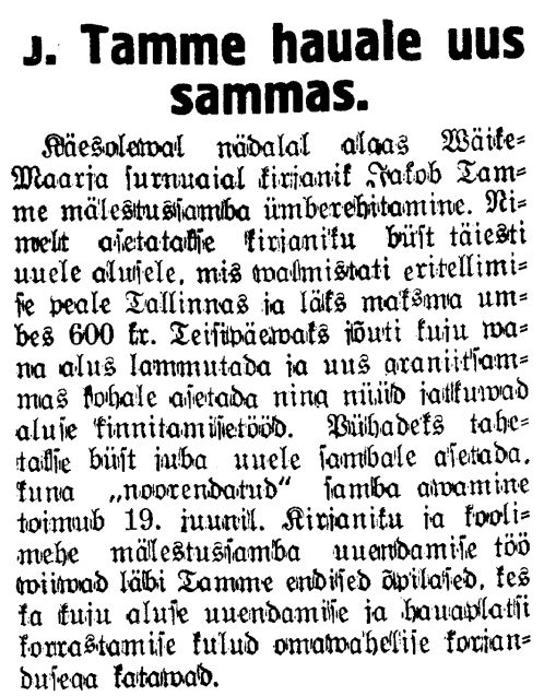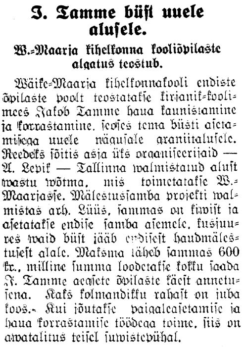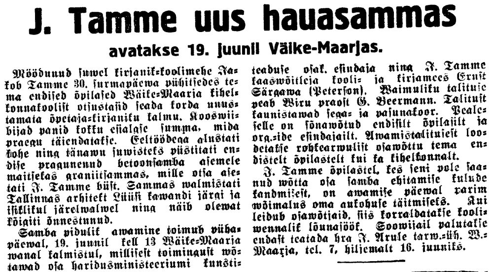 "Virumaa Teataja" 27.05.1938. Mälestussamba alus on Tallinnas valminud. Selle projekti valmistas arhitekt Lüüs. Vajalik raha 600 krooni kogutakse endiste õpilaste annetustest. Kui töödega jõutakse lõpule, siis on avamine teisel suvistepühal.