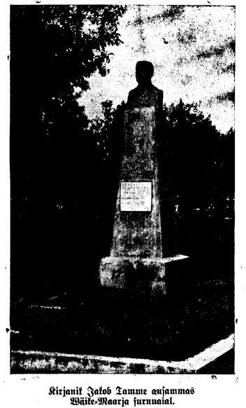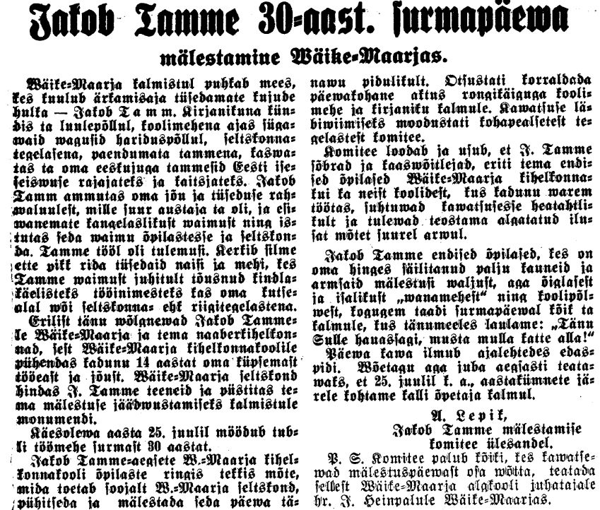 Varsti peale J. Tamme surma tekkis siinsel rahval mõte tema mälestuse paremaks jäädvustamiseks. Tema matmiskohta, Väike-Maarja kalmistule. Monumendi püstitamiseks loodeti rahalist abi saada peotoimkonnalt. Esimene teadaolev ausamba raha kogumise pidu toimus 26.12.1908. Esinejateks olid mees- ja segakoor, keelpilliorkester M. Meose juhatamisel. Jakob Liiv esines kõnega, milles käsitles Jakob Tamme maailmavaadet.
