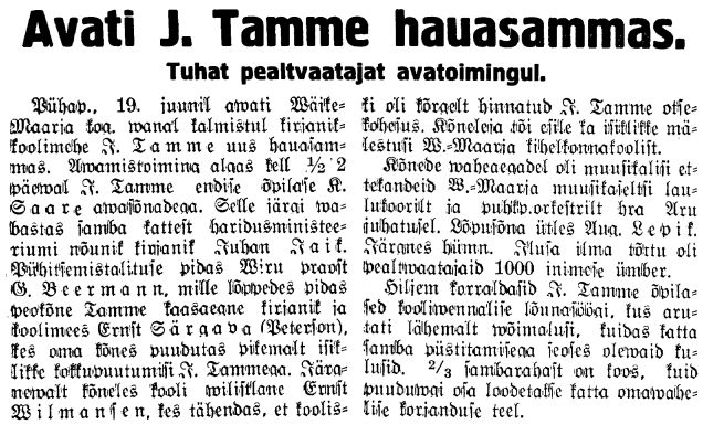 - Kalmistul pidas vaimuliku talituse pidas pastor Wiks, milles ta tõi välja Tamme kui vaimuliku luuletaja, kelle lauludest kolm on kiriku lauluraamatus. Endiste õpilaste nimel kõneles ja pani pärja Wilmansen. Esinesid ka kirjanik Jakob Liiv, A. Liiv, Landberg ja Porkuni põllumees Jaan Ots. Tagasi minnes pandi pärg Vabadussõja monumendile.
