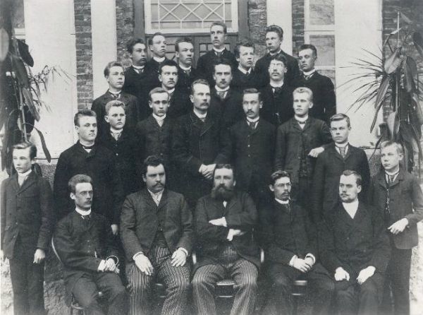 Eesti Aleksandri Linnakooli lõpetajad 1893. Esireas õpetajad: P. Goveino, Jakob Tamm, A. Anson, M. Nikolajev, A. Riikmann.