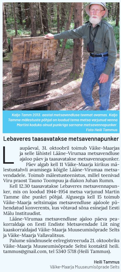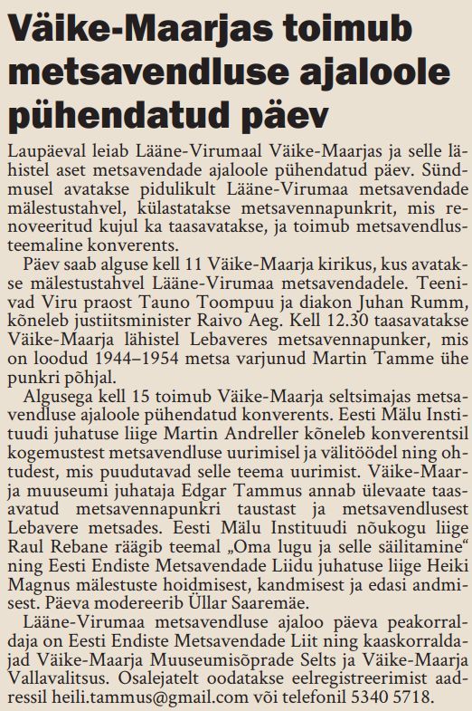 "Kuulutaja" 30.10.2020 ja http://www.kuulutaja.ee/vaike-maarjas-toimub-metsavendluse-ajaloole-puhendatud-paev/