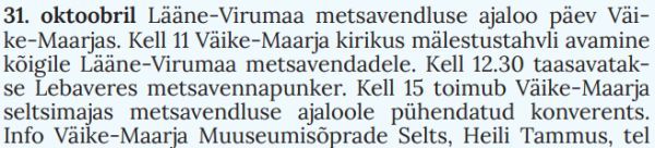 - Metsavendluse teemaline konverents Väike-Maarja seltsimajas algusega kell 15. Päeva modereeris Üllar Saaremäe ja sellel esinesid: