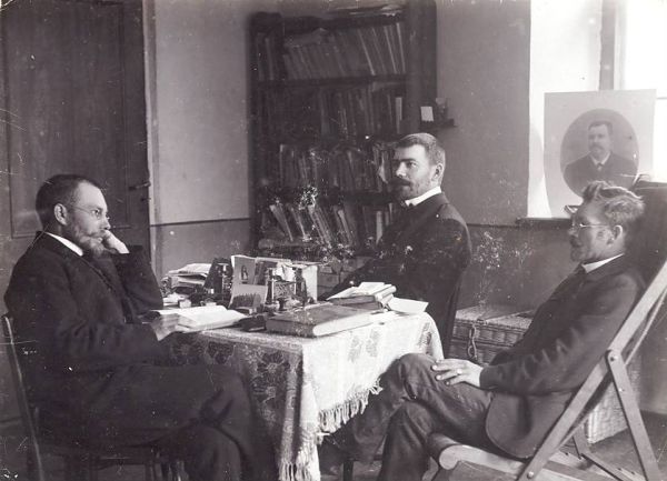 Õpetajad (vasakult) Andres Allast ja Märt Meos ja kirjanik Jakob Liiv õpetaja Allase korteris Väike-maarjas, umbes 1911. RM F 60, SA Virumaa Muuseumid, http://www.muis.ee/museaalview/2108131.