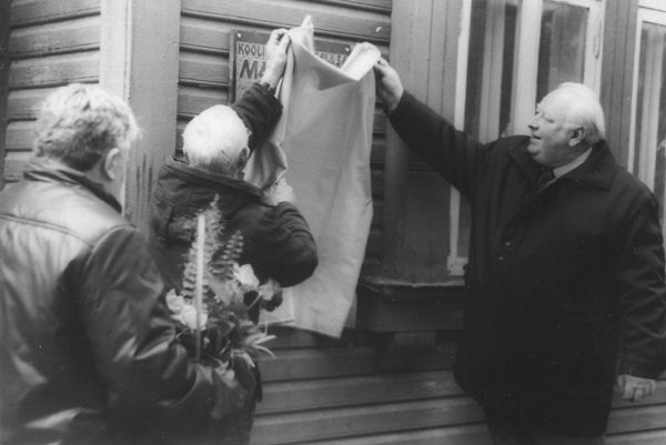 Mälestustahvlilt eemaldavad katte Viljandis koolmeistrina töötav Märt Meose onupoeg (või oli vennapoeg?) Jaan Meos (Märt elas viimased eluaastad tema juures Viljandis), Väike-Maarja koduloouurija ja endine õpetaja Eduard Leppik. (kes hoiab lilli?).